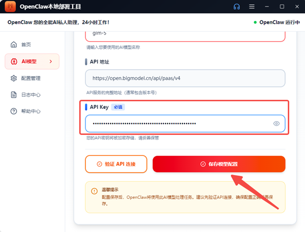 把API Key(如果需要)粘贴进去,点“保存模型配置”。看到“模型配置成功”的提示,OpenClaw就拥有了理解指令和执行任务的能力,真正成了你的AI助手。