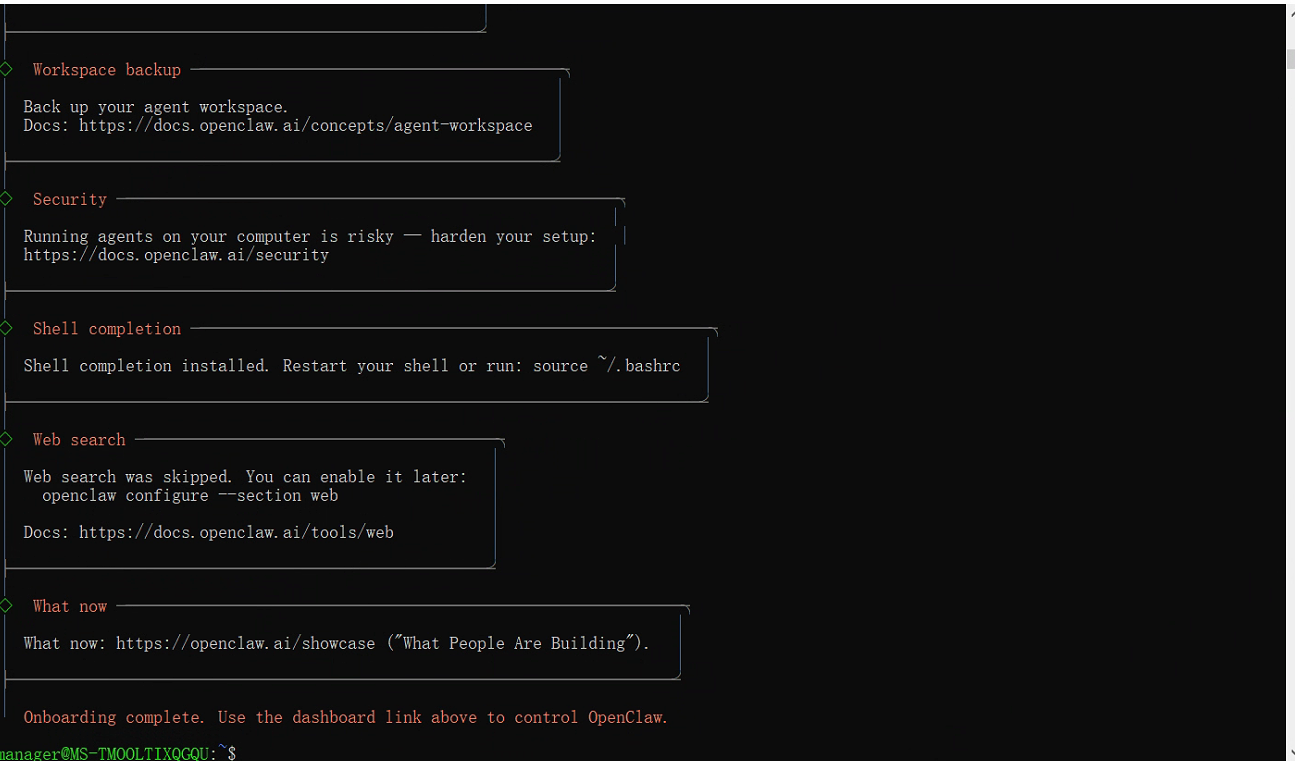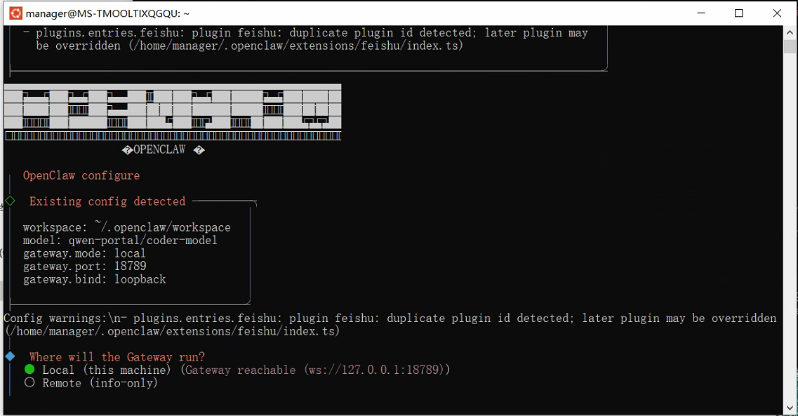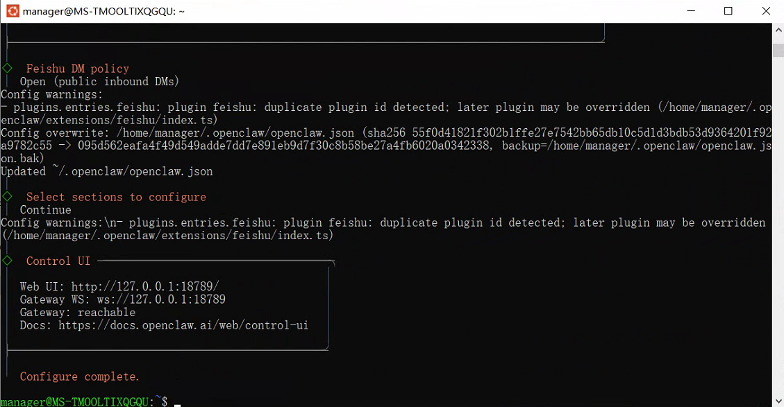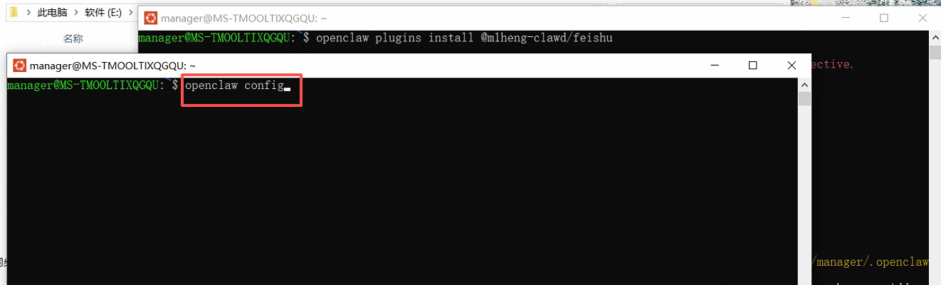 8.2、安装成功后,重新打开一个Ubuntu终端窗口,输入:openclaw config
