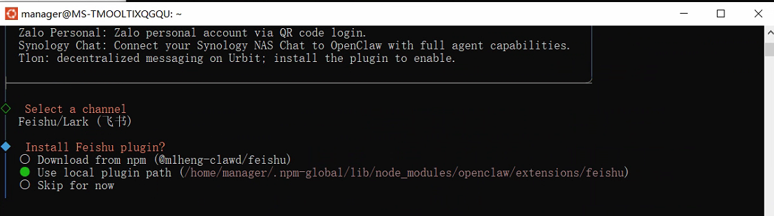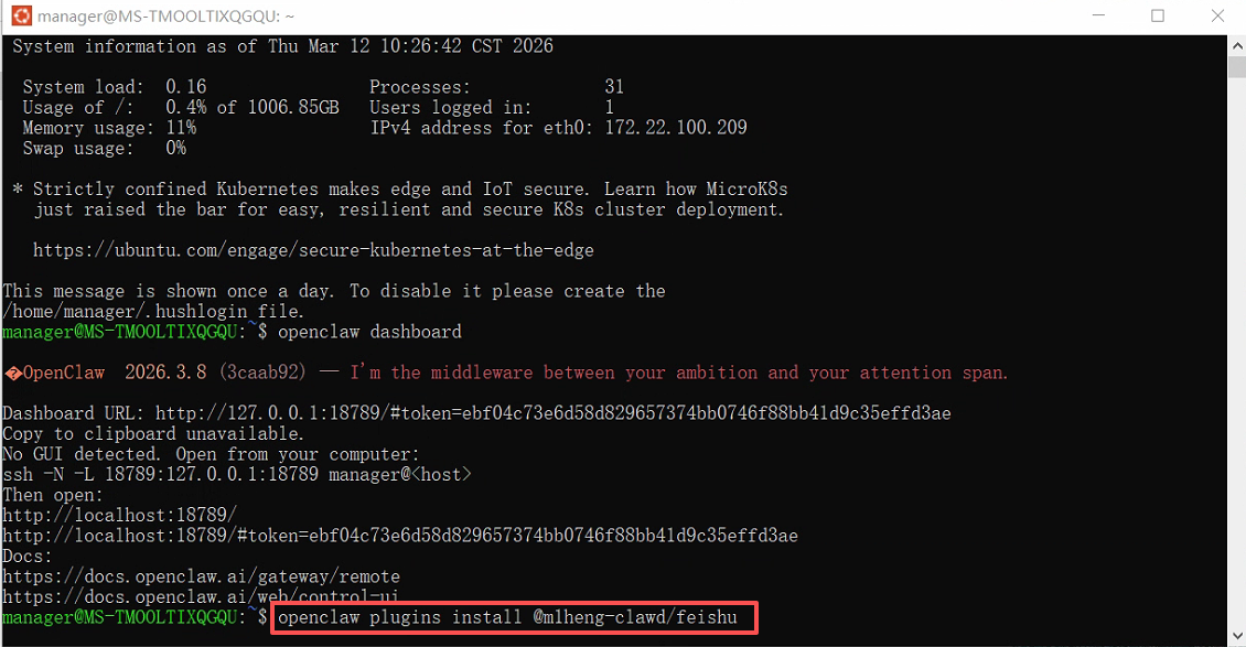 8.1、回到OpenClaw终端,安装飞书插件:openclaw plugins install @m1heng-clawd/feishu