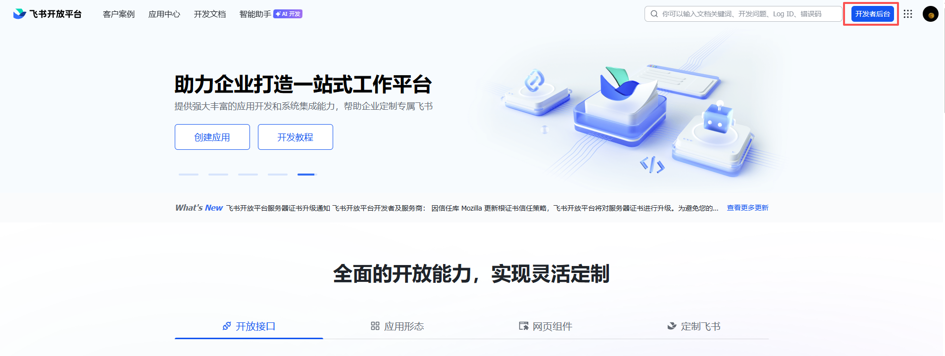2、进入飞书开发平台:https://open.feishu.cn,点击进入开发者后台