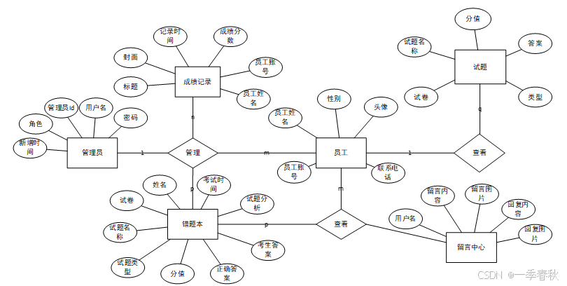 结合系统的需求分析和功能要求,得出本系统所需的数据库概念模型,某企业员工考试系统实体联系图如图