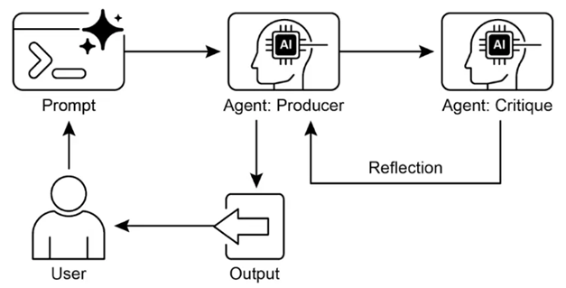 与简单的链式传递或路径选择不同,反思引入了反馈循环。智能体不只生成输出,还会审视该输出(或生成过程),识别潜在问题或改进空间,并据此生成优化版本或调整后续行为。一种高效的反思实现方式是将流程分为两个逻辑角色,生产者(Producer)和批评者(Critic),其典型流程包括执行——评估/批判——反思/优化——迭代。