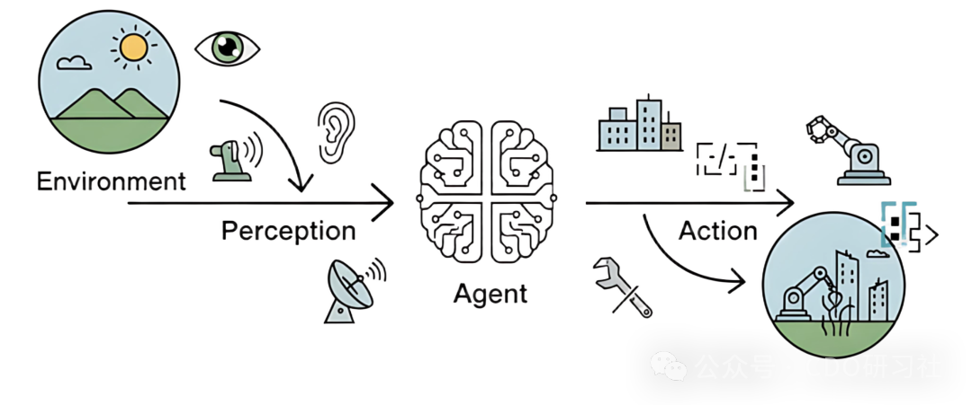 然而,真正赋予智能体"智能"的,是其自主性(Autonomy)。智能体并非只是被动响应外部刺激或严格执行预设指令的程序,它能够基于其感知和内部状态进行独立决策,以达成其设计目标。这种从感知到行动的闭环,构成了所有智能体行为的基础,如图1.1所示。