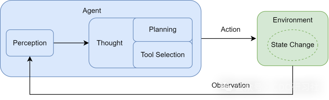 行动并非循环的终点。智能体的行动会引起环境 (Environment) 的状态变化 (State Change),环境随即会产生一个新的观察 (Observation) 作为结果反馈。这个新的观察又会在下一轮循环中被智能体的感知系统捕获,形成一个持续的“感知-思考-行动-观察”的闭环。智能体正是通过不断重复这一循环,逐步推进任务,从初始状态向目标状态演进。