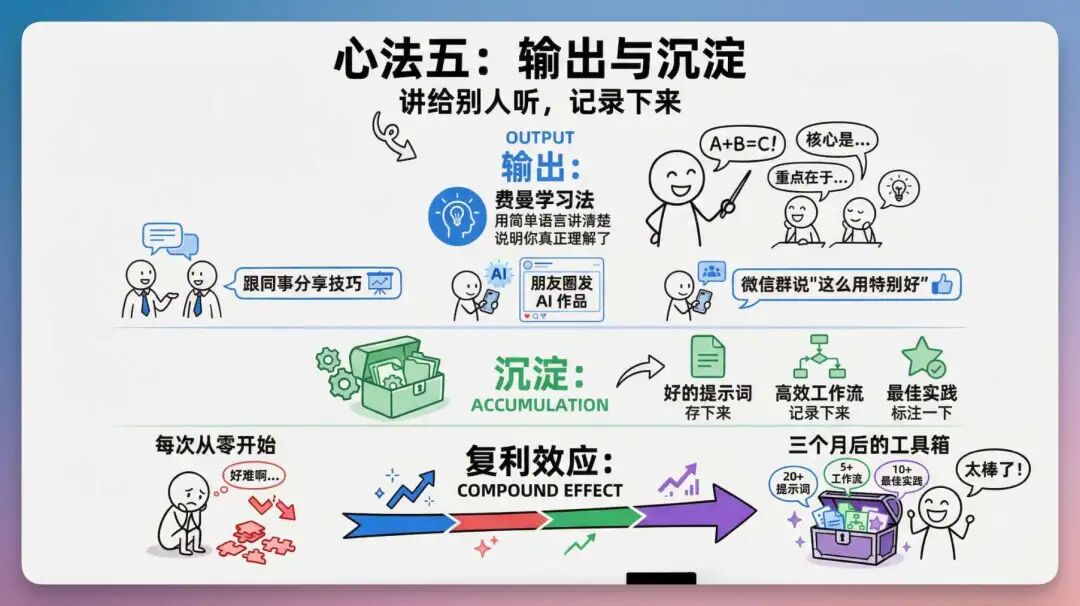 试着把你学到的东西讲给别人听。跟同事分享一个你用 AI 提效的小技巧。在朋友圈发一条你用 AI 画的图。甚至只是在微信群里说一句「我今天发现 XX 这么用特别好」。