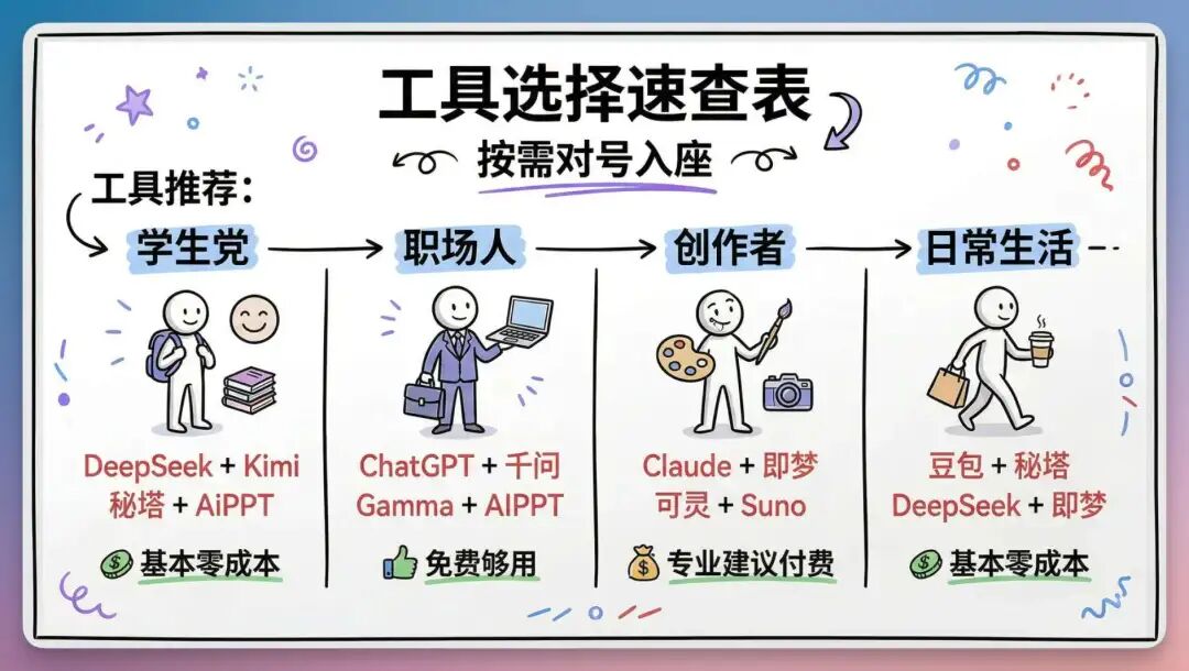 如果你已经在用 AI,日常有了自己的工具和习惯,可以直接跳到第三章「进阶篇」和第四章「洞察篇」,那里有更系统的方法和前沿资源信息。