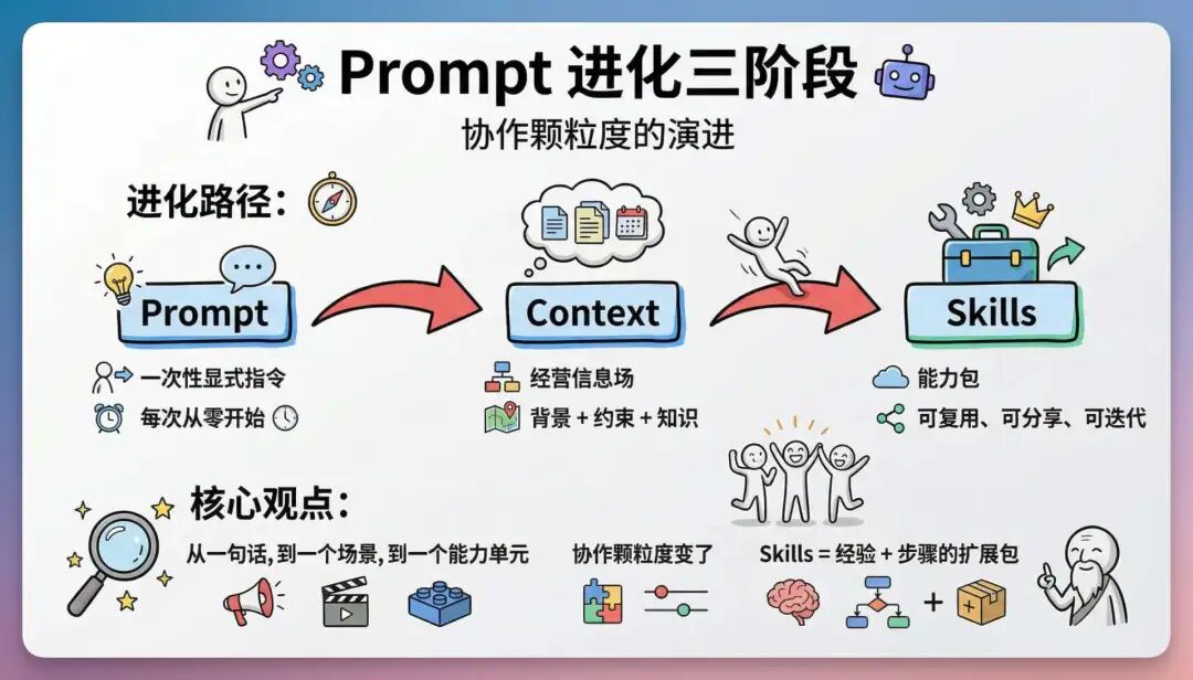 就这么简单。别把它神秘化。可以看之前发过的一篇文章从 Prompt 到 Agent Skills:AI 在业务场景应用有了新玩法!(附私董会Case)