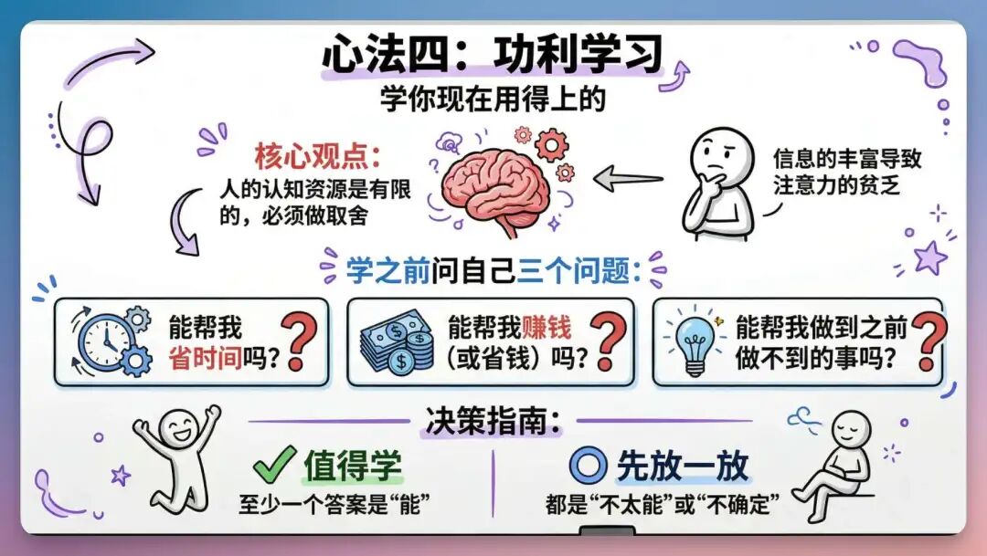 学东西要功利一点。诺贝尔奖得主赫伯特·西蒙说过:「信息的丰富导致注意力的贫乏。」他本人就是 AI 领域的奠基人之一,同时也研究人类认知的局限性。他的结论是:人的认知资源是有限的,必须做取舍。