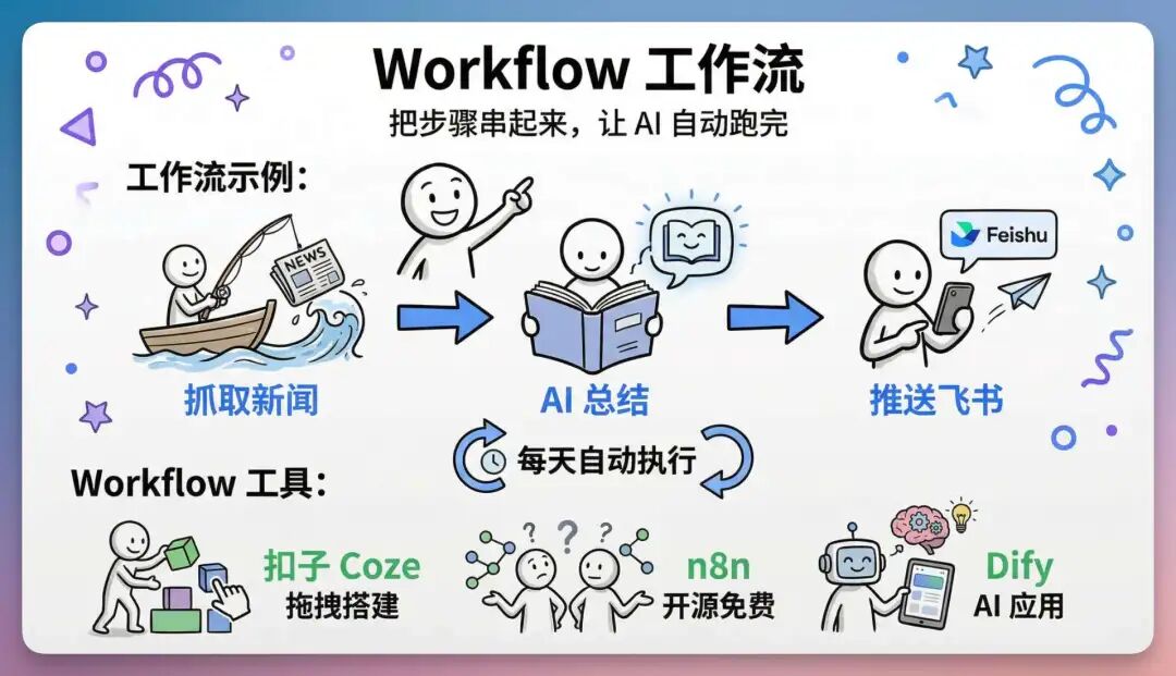 提示词和 Skills 解决的是「单次对话怎么更好」的问题。但很快你会遇到另一个需求:我能不能把好几个步骤串起来,让 AI 自动跑完?