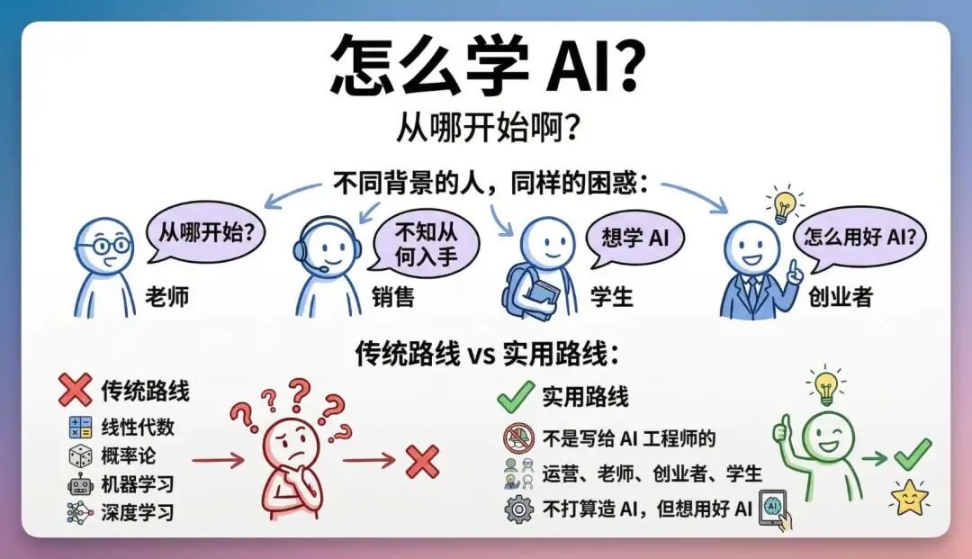 先说清楚:这篇文章不是写给 AI 工程师的。 如果你是计算机科班出身,想去大厂做算法岗,传统路线图对你有用,按部就班学就好。但如果你是运营、老师、创业者、学生、自由职业者,不打算靠「造 AI」吃饭,但想把 AI「用好」,那这篇写给你。