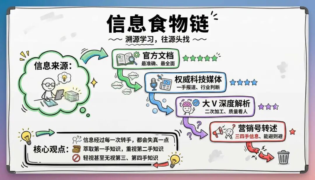 各大 AI 实验室的官方文档是源头,最准确、最全面,但不一定好读。权威科技媒体(国内的话机器之心、量子位等等,国外的话MIT Technology Review、The Verge、The Batch的原创报道等)基于一手素材做分析,会加入行业判断,信息失真很小。大 V 的深度解析是二次加工,质量取决于作者水平,好的大 V 能帮你消化复杂信息,差的可能带偏你。营销号的转述就不用说了,基本是三四手信息,能避则避。