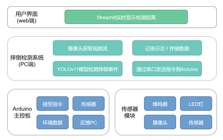 - PC 端核心检测模块:系统的大脑,通过 USB 摄像头采集实时视频流,基于训练好的 YOLOv11 模型对视频帧逐帧推理,识别摔倒行为,同时负责与 Arduino 的串口通信、数据日志记录;