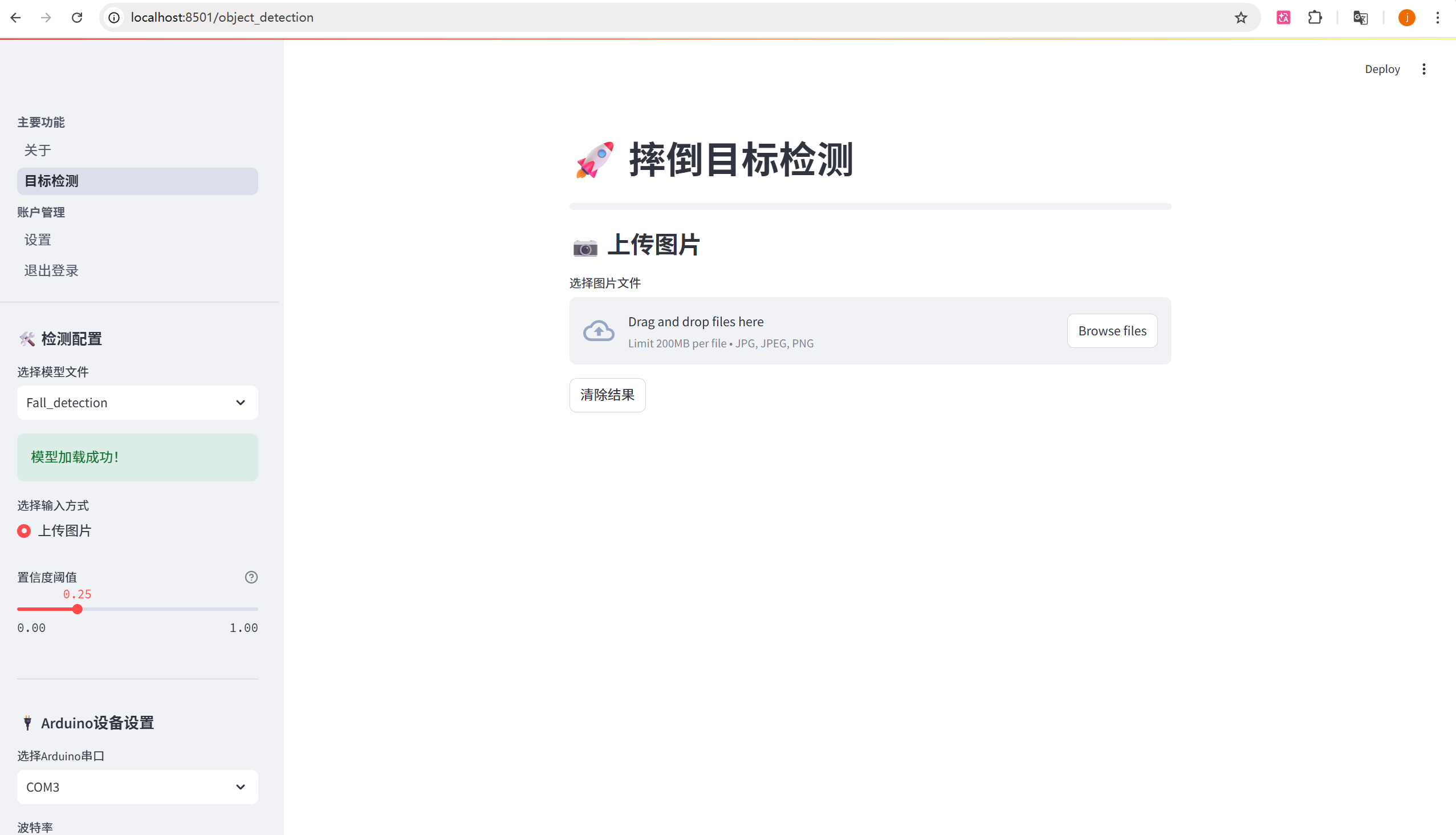 - Streamlit Web 监控端:系统的可视化交互端,实时显示检测画面、当前状态(正常 / 摔倒),支持查看检测日志,也能简单配置报警方式,让课设的交互性更优。