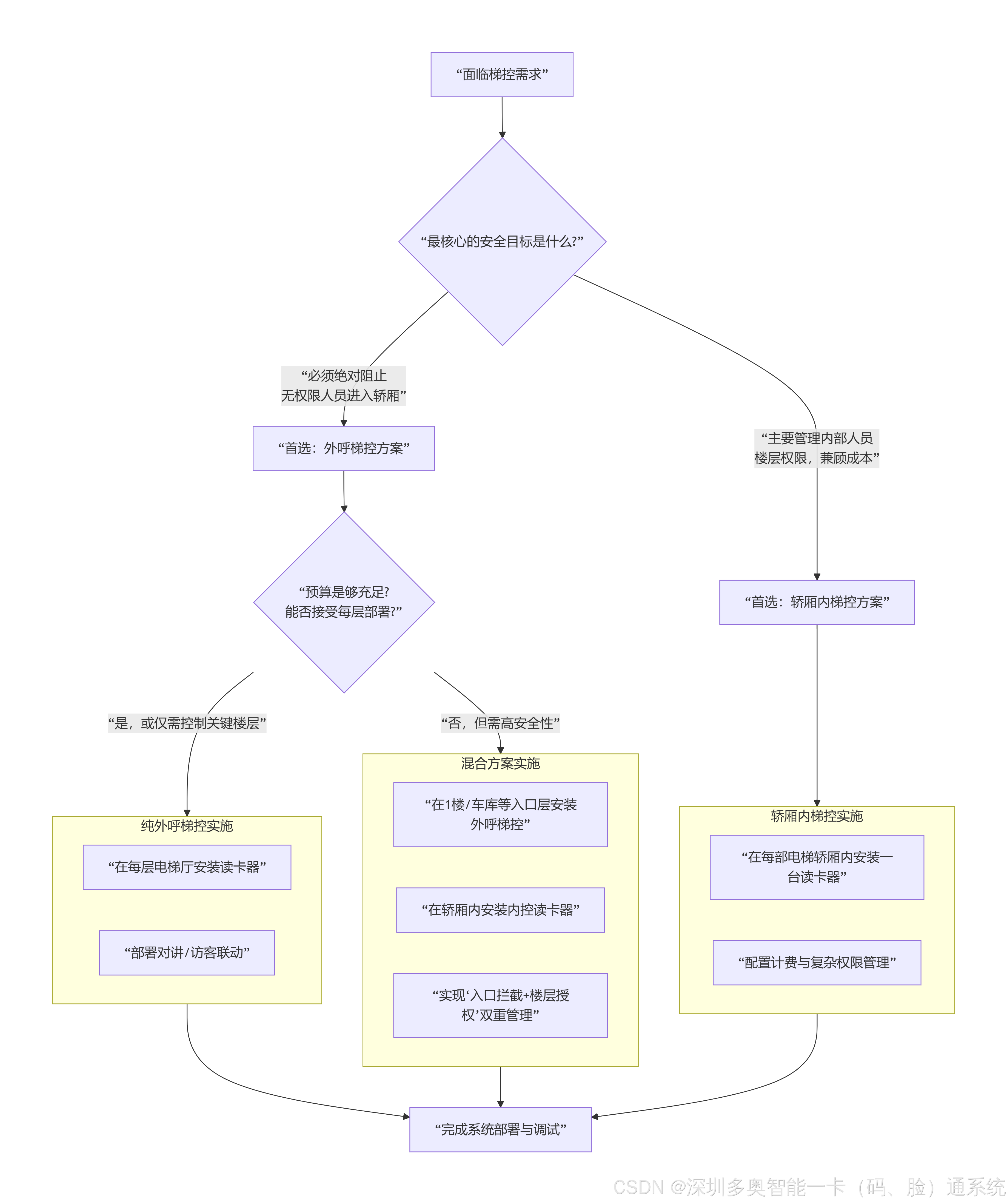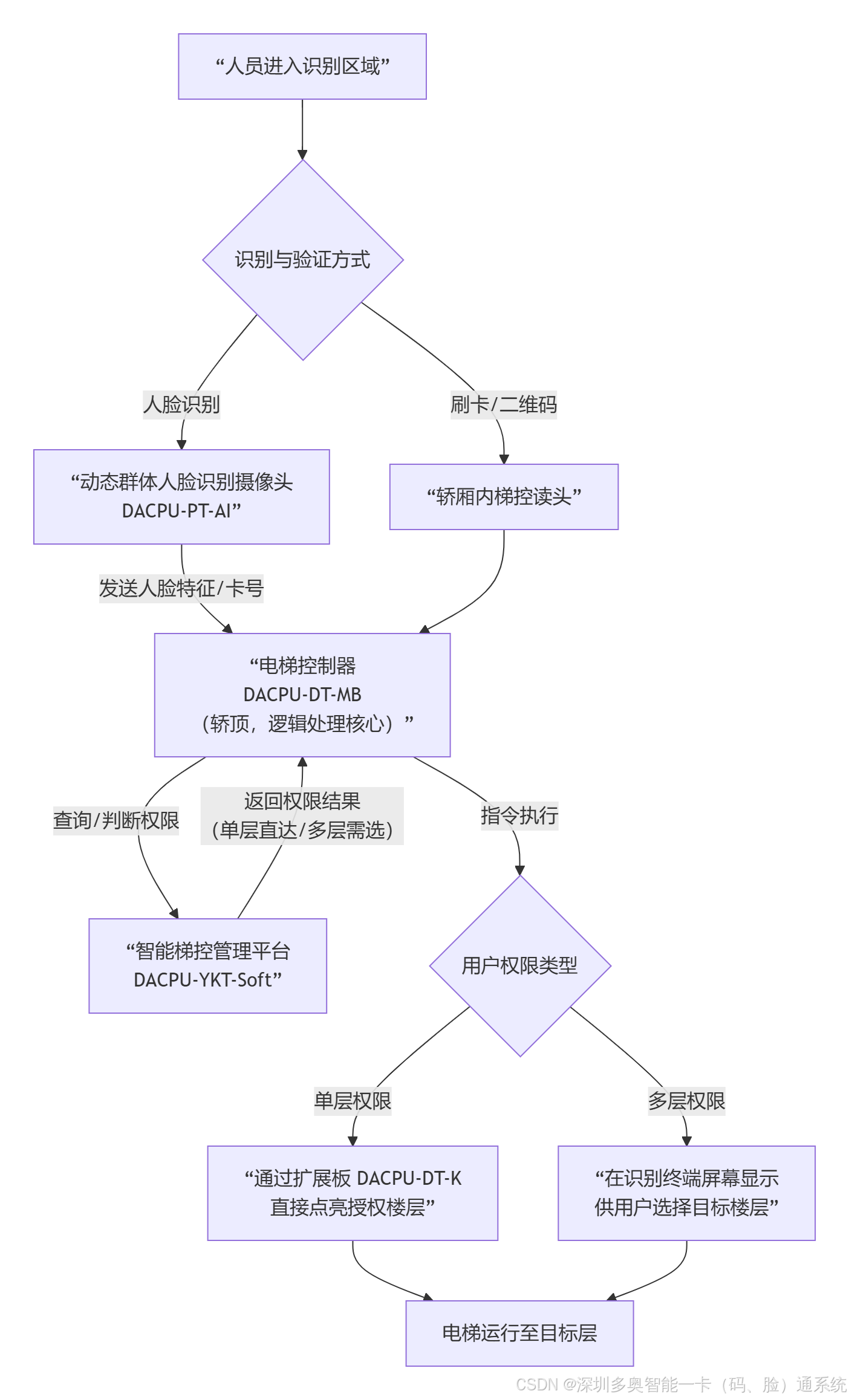 | 呼梯方式 | 人脸识别/刷卡/二维码 → 外呼控制器 | API指令 → 外呼控制器 |