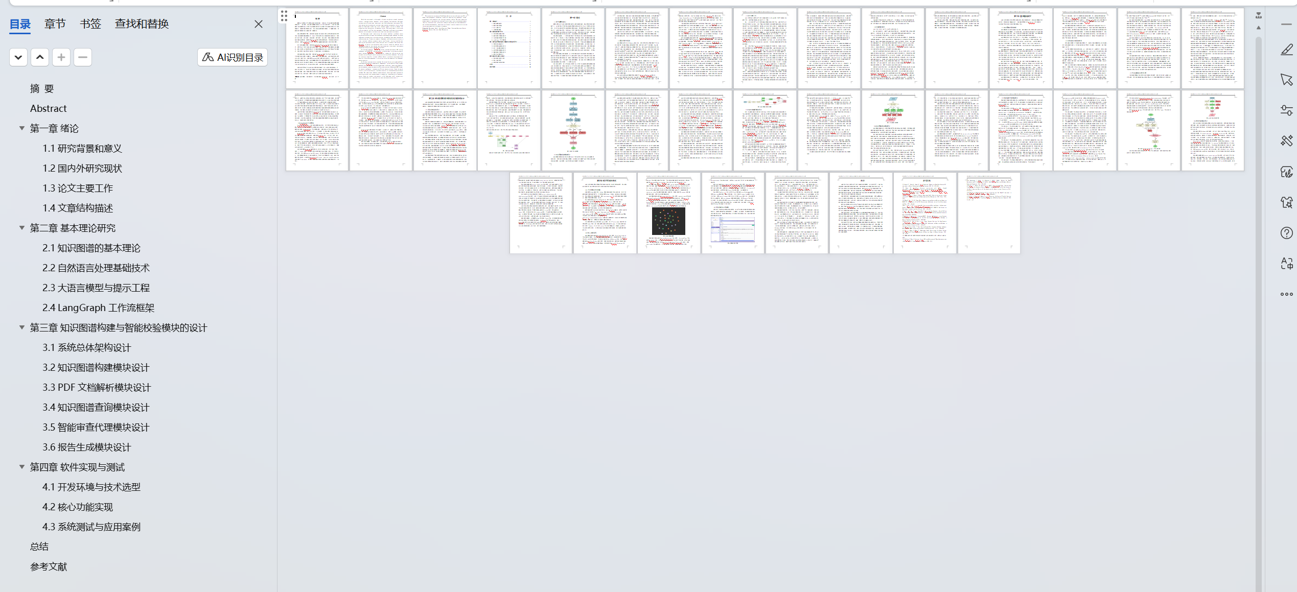第四章为软件实现与测试,介绍系统的具体实现细节和测试验证结果。首先描述开发环境和技术选型,包括Python语言生态系统、主要依赖库的版本和功能、配置管理方案等。然后详细说明各核心模块的实现,包括PDF解析模块如何集成PyMuPDF和pdfplumber双引擎、知识图谱模块如何使用NetworkX库进行图操作、审查代理如何调用LangGraph API、报告生成模块如何实现模板填充等。接着介绍Web应用的实现,包括Flask路由设计、SQLite数据库schema定义、多线程任务处理机制、前端页面的交互逻辑等。最后展示系统的测试结果,包括功能测试、性能测试和实际应用案例,通过具体数据验证系统的有效性和实用性。本章将理论设计转化为可运行的软件系统,体现了工程实现能力。