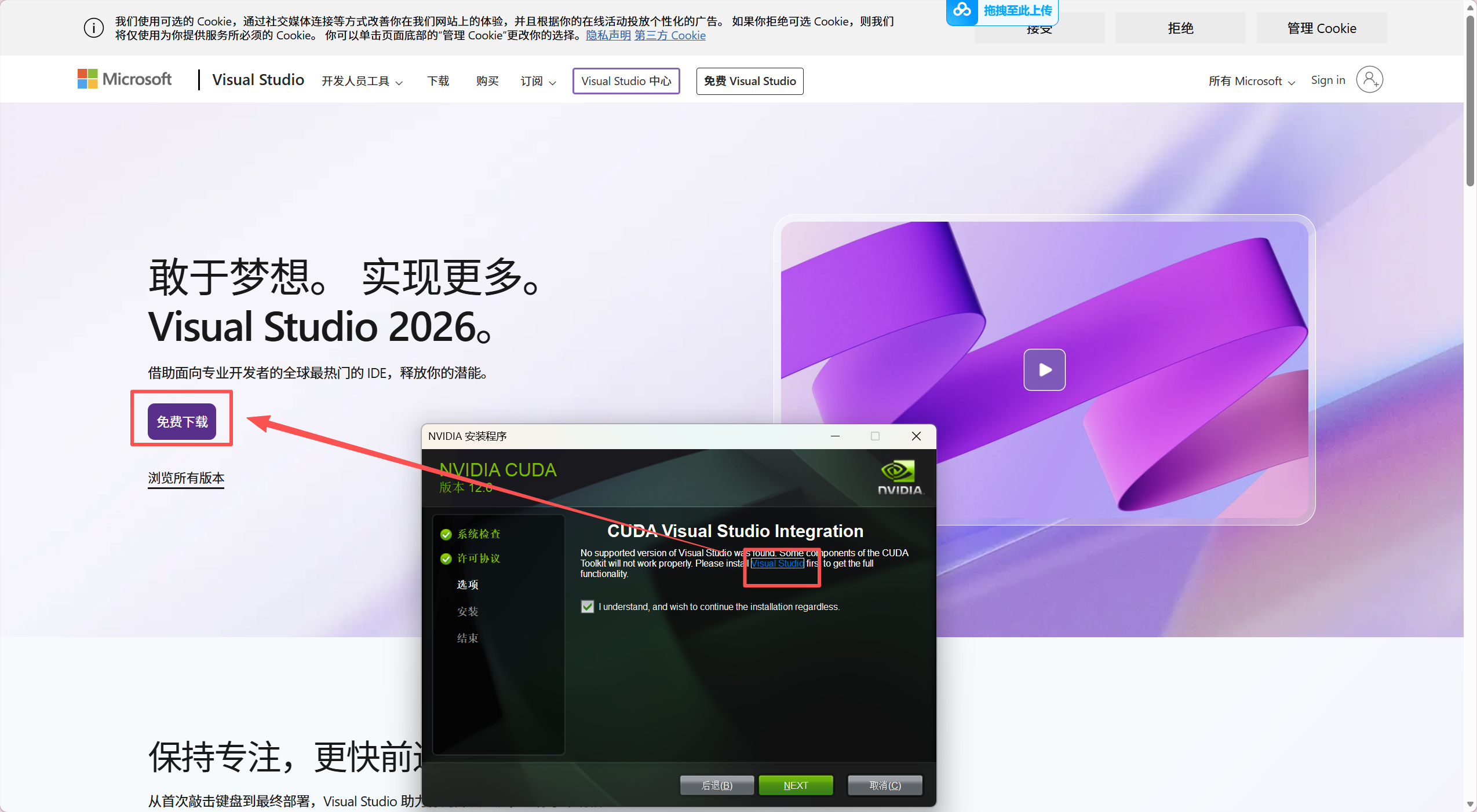 - 解决VS依赖:出现"No support Visual Studio"需安装VS2026