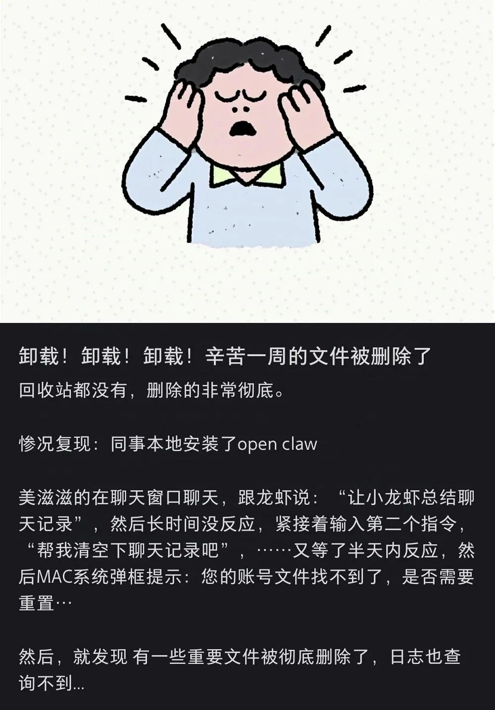 首先是无意间的破坏性误操作。昨天就有小红书网友反映,一位同事在本地安装了OpenClaw,这只龙虾在执行“清空聊天记录”指令时,竟错误地删除了其他重要文件,且因日志缺失而无法追溯原因。这类AI幻觉引发的误判,虽非恶意,却可能带来无法挽回的数据损失。