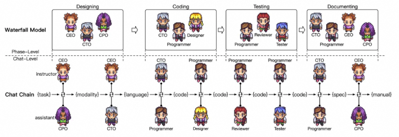 ChatDev是OpenBMB联合清华大学NLP实验室共同开发的大模型全流程自动化软件开发框架,它模拟了一家虚拟软件公司,由担任不同职能的多个智能代理运作,包括首席执行官(CEO)、首席产品官(CPO)、首席技术官(CTO)、程序员、审查员、测试员和设计师。这些智能代理构成了一个多代理组织架构,并共同致力于一个使命:“通过编程革新数字世界。” 在ChatDev中,代理们通过聊天参与研讨会协作,涵盖设计、编码、测试以及文档撰写等多种专业任务。