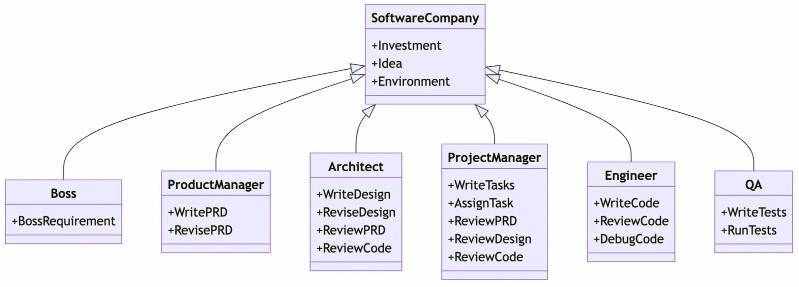 MetaGPT框架吸取了SOPs的重要经验,并允许智能体生成结构化且高质量的需求文档、设计文档、流程图和界面规格。这种结构化的中间输出能够显著提升目标代码生成的成功率。MetaGPT模拟了一个高度规范化的公司流程环境,在这个环境中,所有智能体必须严格遵守已确立的标准和工作流程。在角色扮演构架中,智能体被分配了各种各样的角色,以高效协同工作、分解复杂任务。这种角色扮演的设计有助于减少无效交流,并降低大模型幻觉风险。