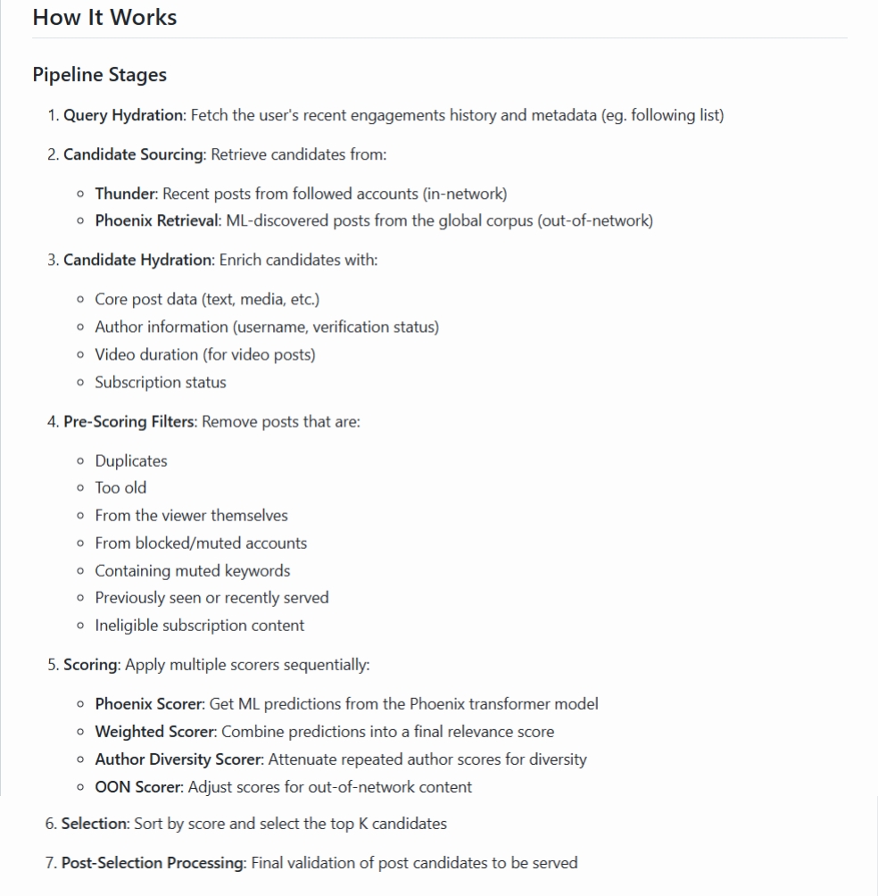开源代码揭示,X的推荐系统已演变为一个高度工程化、多阶段过滤的“内容流水线”。这一过程始于 “查询充实” ,系统首先获取用户的实时互动图谱作为上下文,紧接着,“候选集获取” 阶段展现了其混合内容策略的核心:一方面,从Thunder源获取用户已关注网络的近期帖子,保障基本盘;另一方面,通过Phoenix Retrieval从全局语料库中挖掘潜在兴趣内容,这是拓展用户边界、延长停留时间的关键。