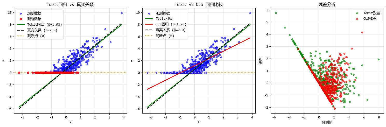 print(f"系数估计偏差 (Tobit): {abs(tobit_model.beta - true_beta):.3f}")