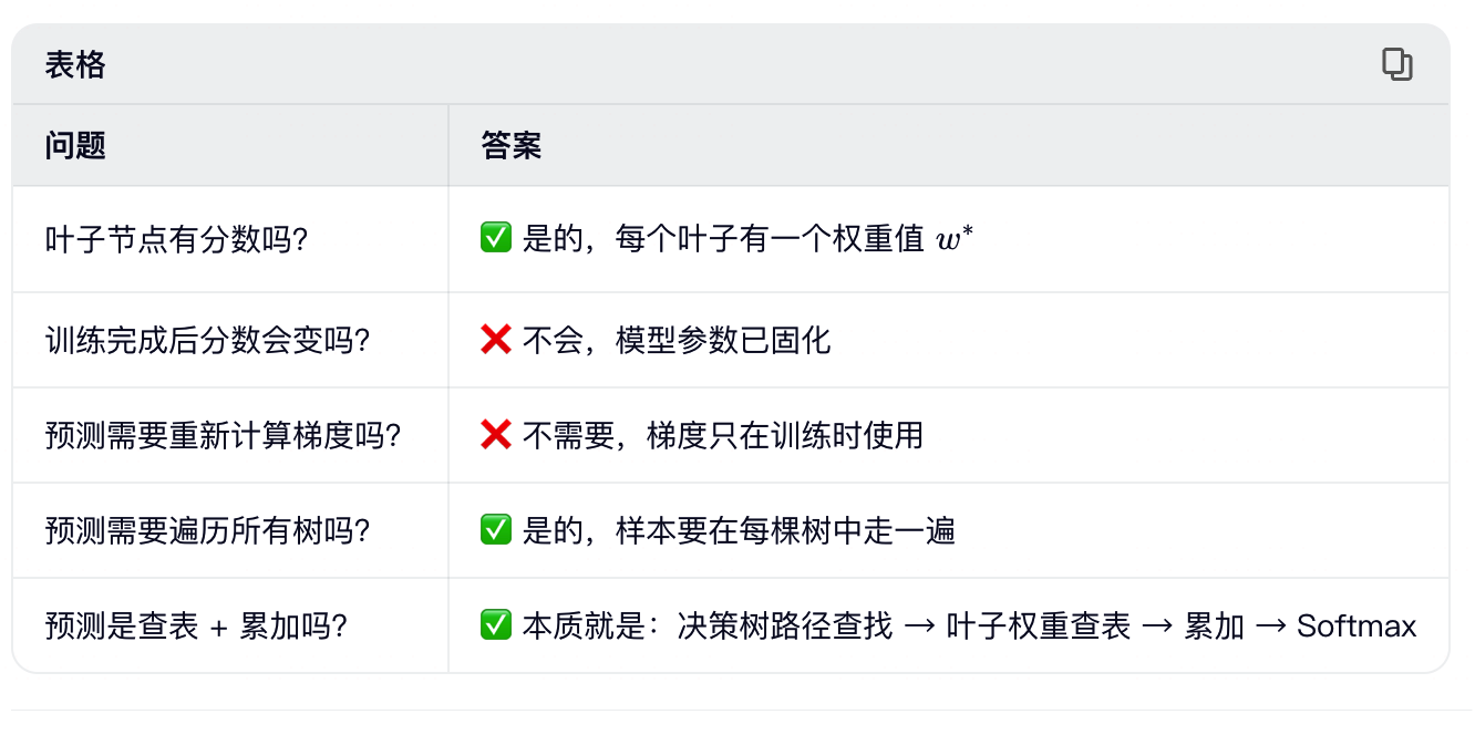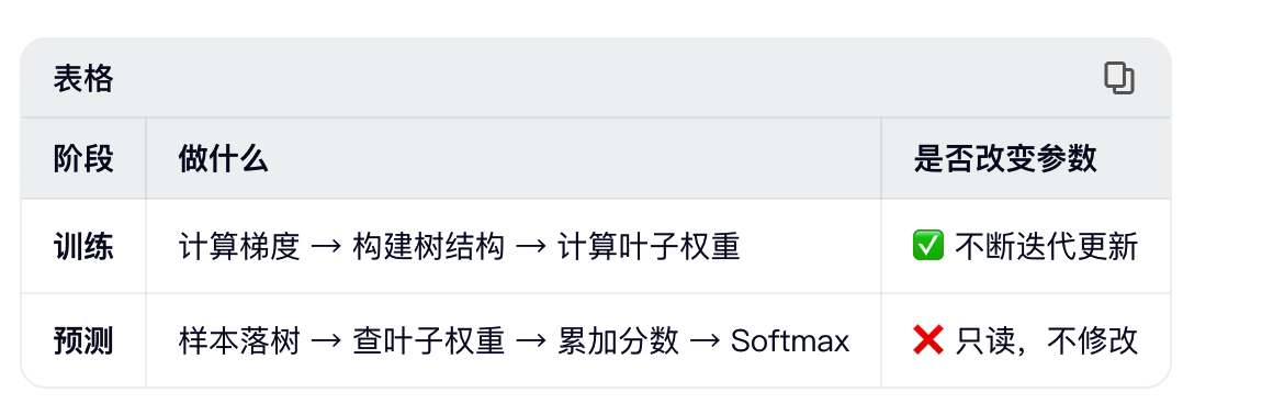 训练是"写模型",预测是"读模型"。训练完成后,所有树的结构和叶子权重都固化了,预测时只需做前向计算(查表 + 累加 + Softmax),没有任何优化或更新操作。