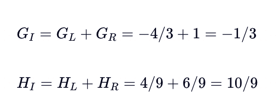 - 对于每个内部节点,计算分裂后的增益,选择增益最大的分裂方式。增益公式如下: