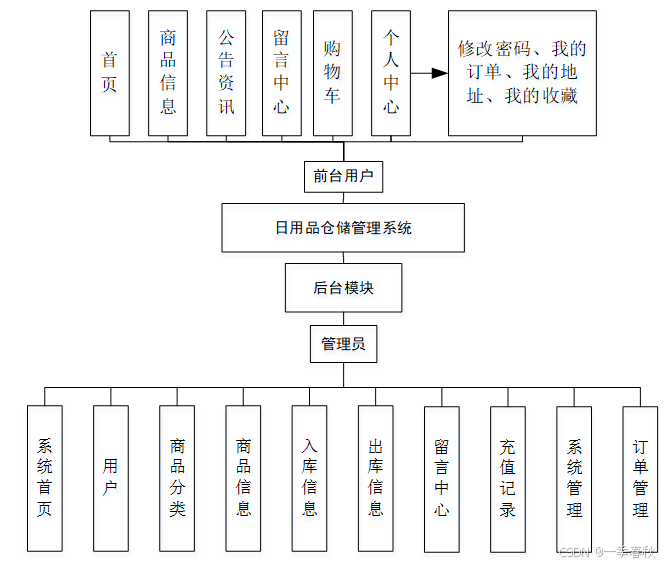 日用品仓储管理系统采用了结构化开发的方法。这种开发方法的优点是控制性比较强,开发过程中采用了结构化和模块化的设计思想,自顶向下,从总体到部分,合理划分系统的结构和模块[11]。结构化开发时使用模块式开发,各模块之间互不影响,方便系统的开发与管理。网站总体功能如下图所示: