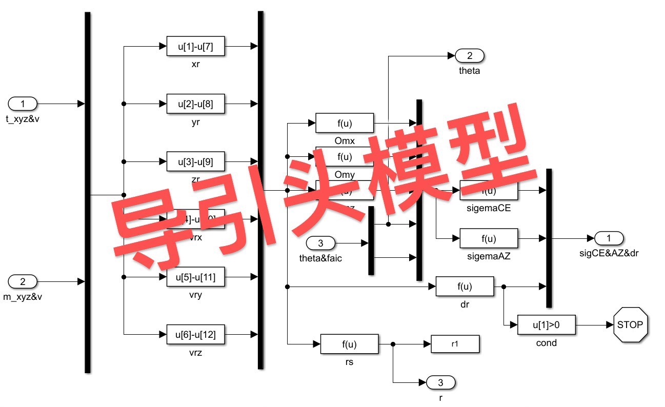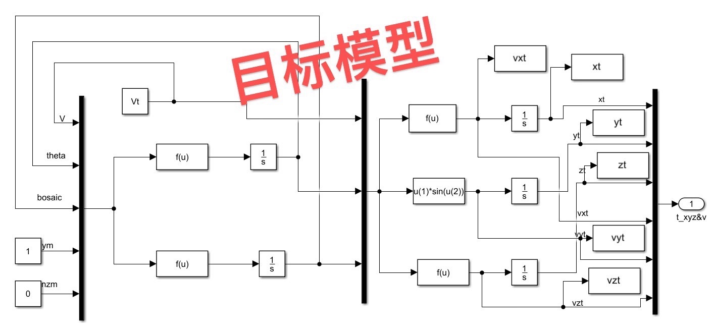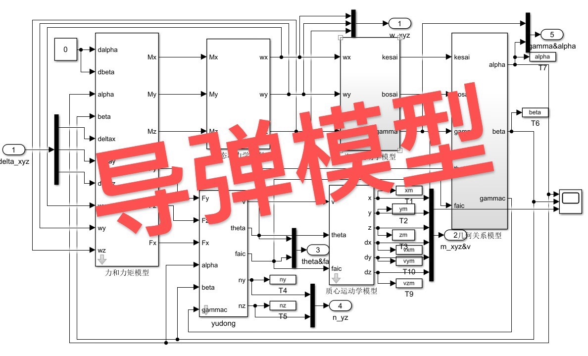 这段代码简单描述了目标在 x 轴方向的位置随时间的变化。Simulink 导弹模型则刻画了导弹自身的动力学特性,它包含了导弹的质量、转动惯量等参数。例如: