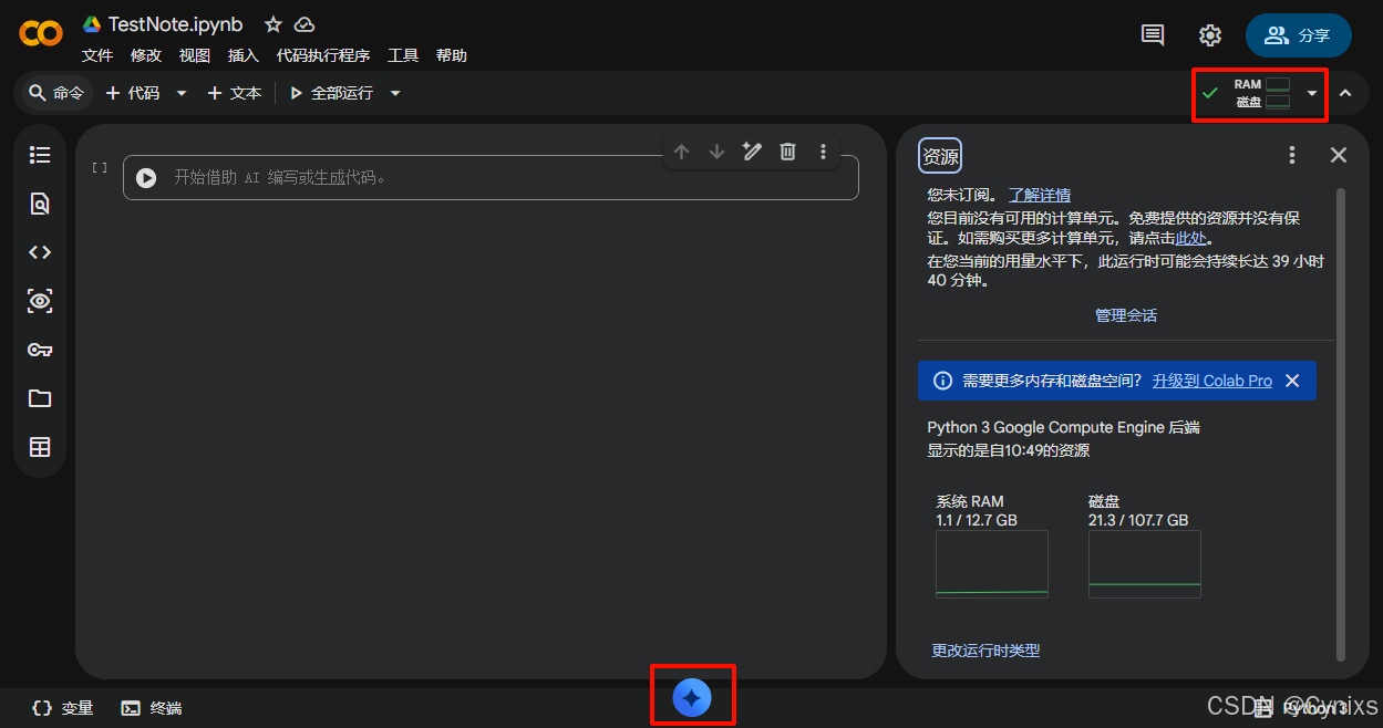 稍微等待十几秒后就进入到了新建的笔记本中,默认的笔记本是没有连接到云端资源的,可以在右上角选择连接。