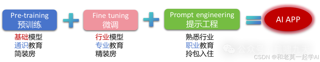 大模型落地时,常见技术点:PE、Fine-tune、RAG、Agent等,共同完成应用需求。