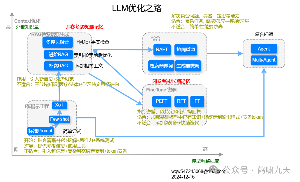 一张图概括如上,这几种技术方案对数据、计算资源、提示工程、检索等要求不同,应用时根据各自情形选择合适的方法。
