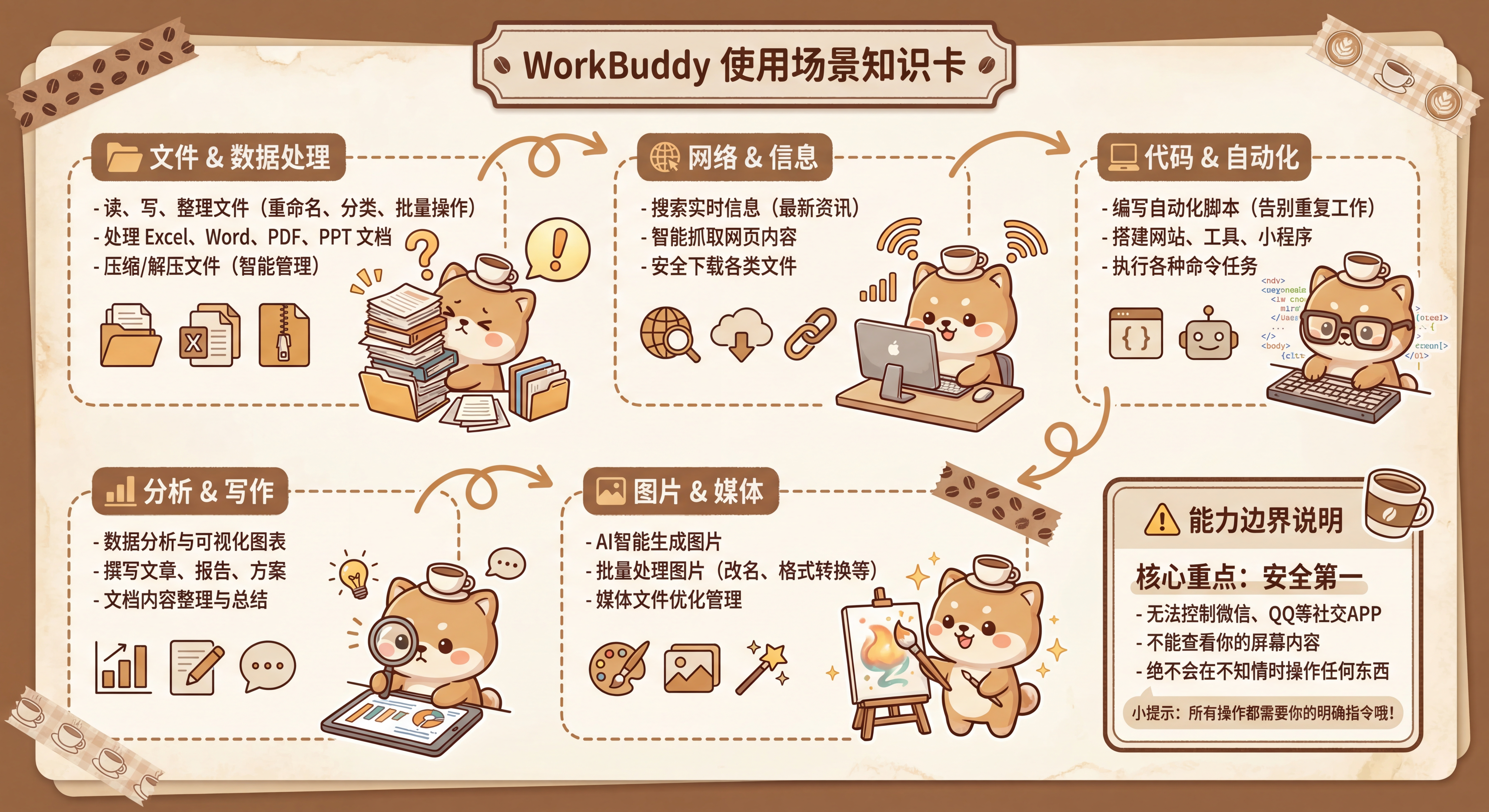 WorkBuddy 就像一个极其听话的全能数字助理。在核心能力上,它能帮你批量重命名、分类整理文件,搞定 Excel、Word、PDF 等各种文档和压缩包,还能直接联网搜索信息、获取网页数据和下载资料。遇到繁琐的重复性工作,它可以直接帮你敲代码写脚本、跑命令甚至搭建小程序。