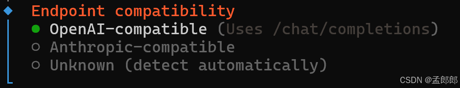 这是最常见的选择,表示你的本地模型服务(如 Ollama、LocalAI、vLLM 等)提供了与 OpenAI 官方 API 兼容的接口,特别是使用了/chat/completions这个端点。绝大多数本地模型工具都兼容 OpenAI API 格式,包括你正在使用的 Ollama。Anthropic-compatible