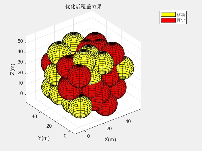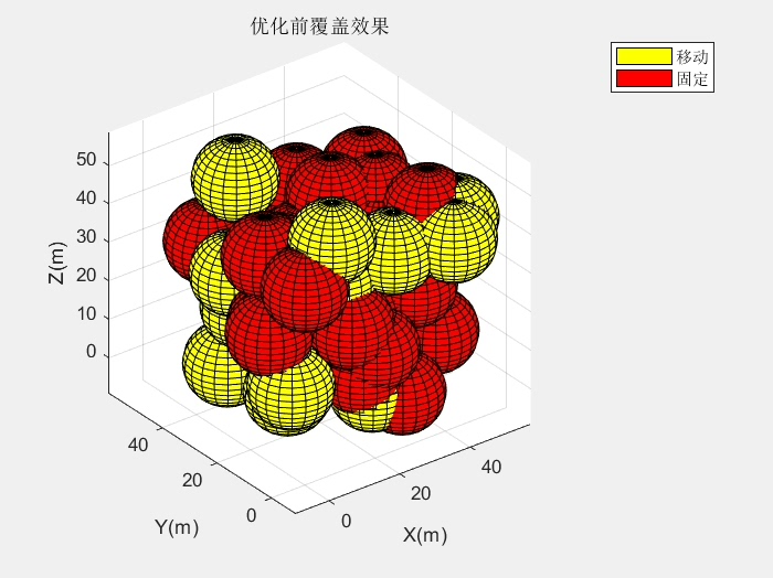 在三维WSN中,每个节点都有一个感知范围,通常是一个球体。我们的目标是让这些球体尽可能多地覆盖整个区域。固定节点的位置是固定的,所以我们只能通过移动可移动节点来优化覆盖。