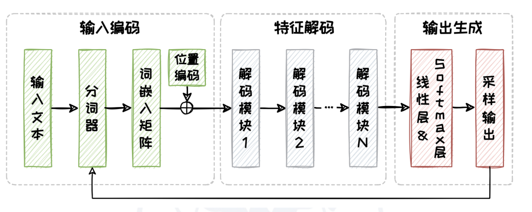Decoder-only 架构仅选取了 Transformer 中的解码器(Decoder)部分,主要包含以下模块: