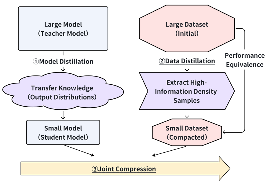 数据蒸馏与压缩技术通过降低数据复杂度、同时保持模型性能,提升大语言模型后训练的效率。该技术包含三大互补方法:用于知识迁移的模型蒸馏、用于数据集压缩的数据蒸馏、用于统一优化的联合压缩。