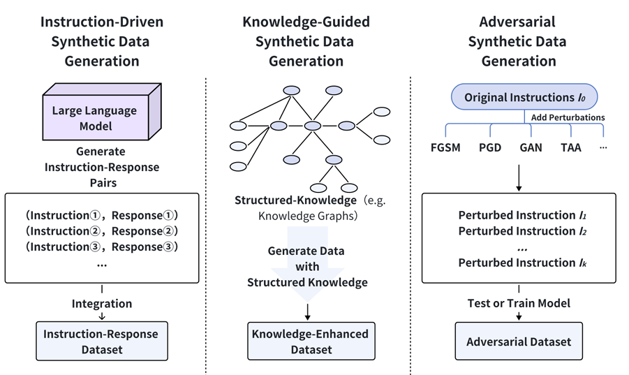 生成合成训练数据是解决数据稀缺问题、提升大语言模型后训练鲁棒性的有效策略。合成数据生成方法可分为三大核心类别:指令驱动、知识引导和对抗生成,三类方法在提升模型能力方面各有侧重。