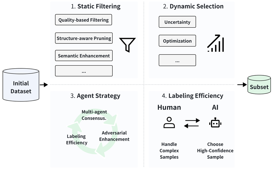 - 数据选择**:从原始数据中筛选高价值子集。①静态过滤:基于数据属性的离线筛选;②动态选择:根据模型不确定性调整数据权重;③智能体策略:通过多模型投票实现可靠筛选;④标注效率:结合主动学习和半监督策略,以低成本实现样本全覆盖。**