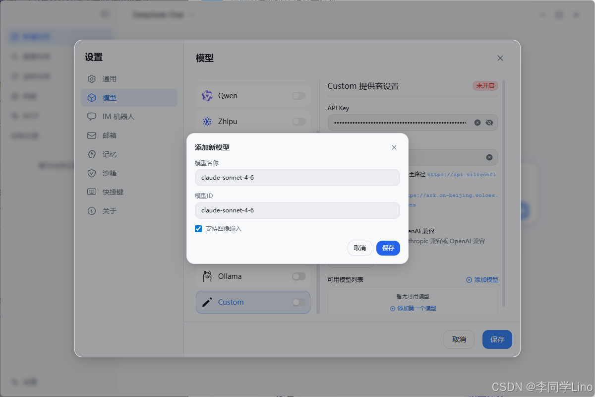 在弹出的窗口中,「模型名称」和「模型ID」都填入你刚才复制的模型代码(比如目前最适合做 Agent 的最强王者:claude-sonnet-4-6)。
