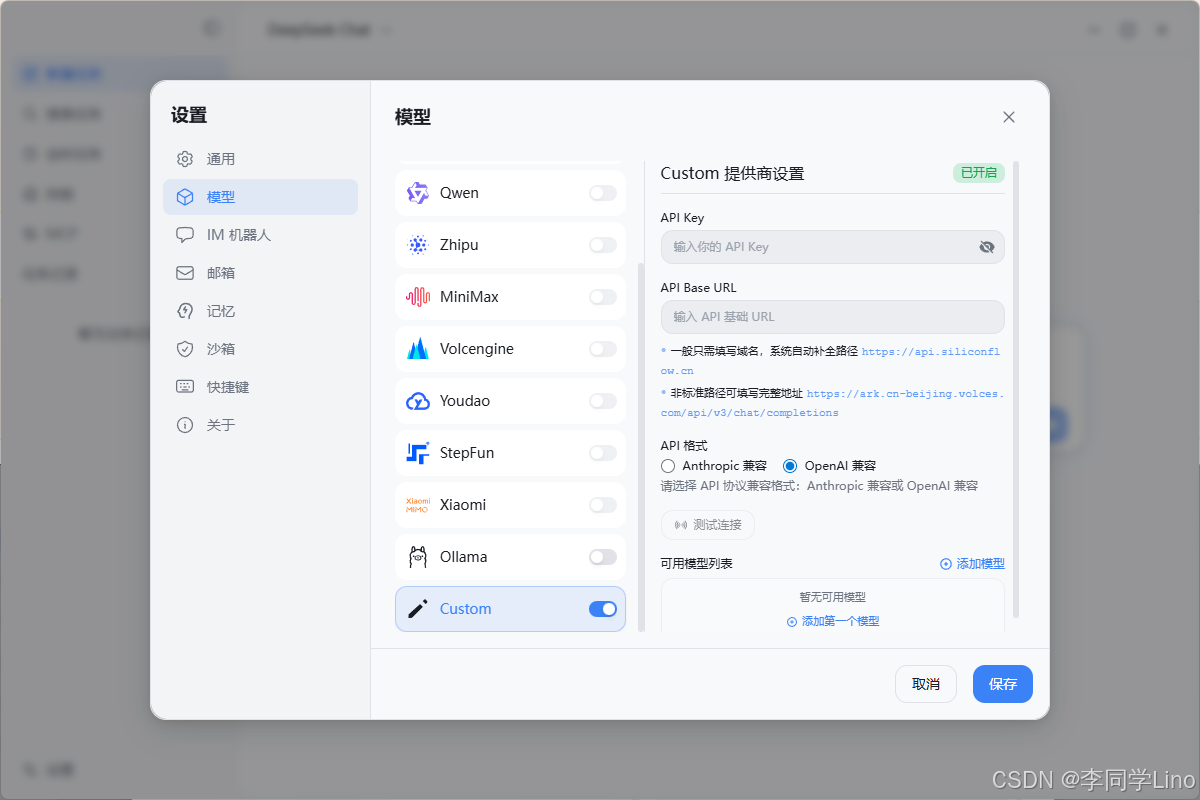 打开 OpenClaw 的「设置 - 模型」你会发现,它非常接地气,原生支持了 DeepSeek、Kimi (Moonshot)、通义千问等一众国内优秀大模型。你可以直接填入国内官方的 API 来使用。
