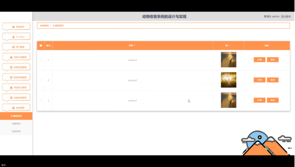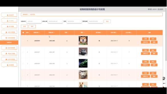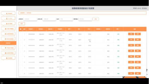 管理员点击动物收容管理。在动物收容页面输入动物名称、选择动物分类、选择动物性别、姓名或选择是否通过进行查询或删除动物收容列表,并根据需要对动物收容详细信息进行详情或删除操作;如图5-13所示: