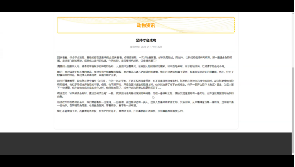 动物资讯:在动物资讯页面的输入栏中输入标题进行查询,可以查看到动物资讯详细信息;动物资讯页面如图5-4所示: