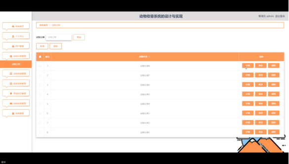 管理员点击动物分类管理。在动物分类页面输入动物分类进行查询、新增或删除动物分类列表,并根据需要对动物分类详细信息进行详情、修改或删除操作。如图5-9所示: