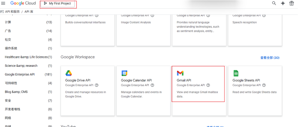 启用 Gmail API:创建一个项目,在搜索栏搜索 "Gmail API" 并点击“启用”。