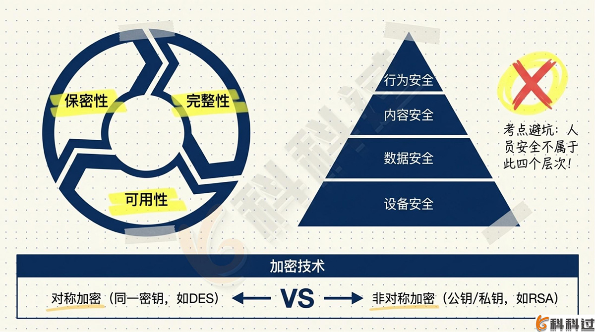 - 信息系统安全层次:设备安全、数据安全、内容安全、行为安全
