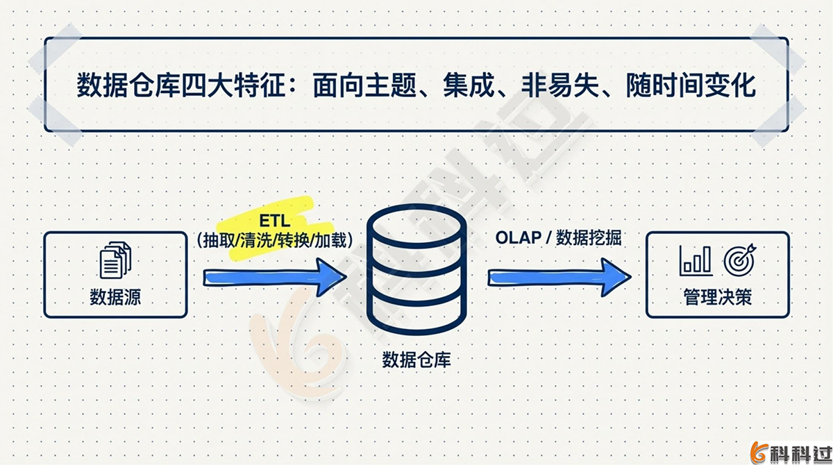 - 数据仓库:面向主题的、集成的、非易失的且随时间变化的数据集合,用于支持管理决策