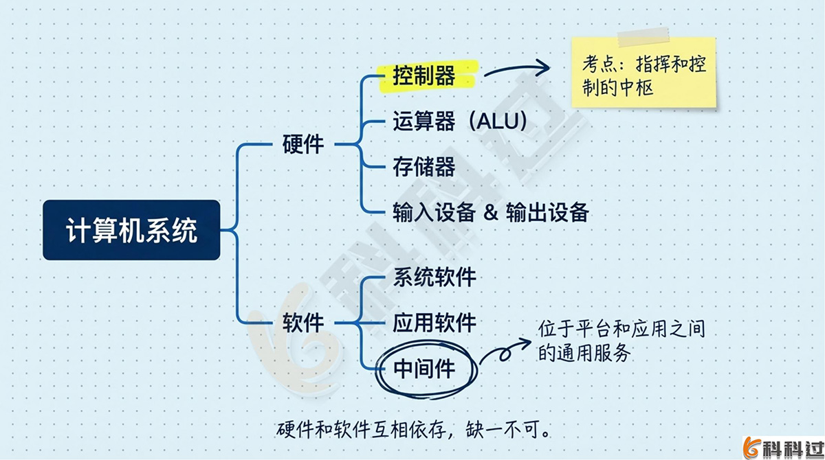 - 计算机硬件:包括控制器、运算器(ALU)、存储器、输入设备和输出设备。其中,控制器是指挥和控制的中枢。