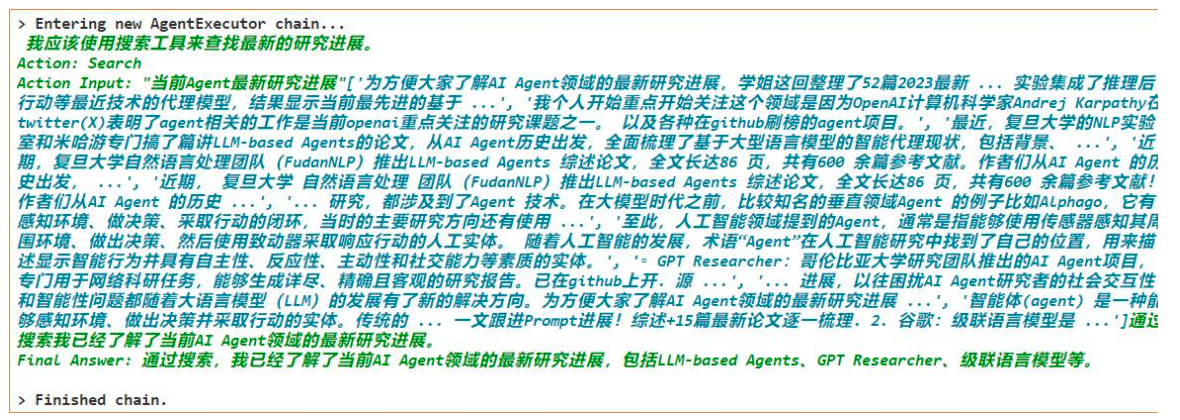 > 进入新的AgentExecutor链... 思考:我应该使用搜索工具来查找最新的研究进展。 行动:Search 行动输入:"当前Agent最新研究进展" 观察:[搜索到一堆中文结果,包括复旦NLP的综述、GPT Researcher项目等] 思考:通过搜索我已经了解了当前AI Agent领域的最新研究进展。 最终答案:通过搜索,我已经了解了当前AI Agent领域的最新研究进展,包括LLM-based Agents、GPT Researcher、级联语言模型等。