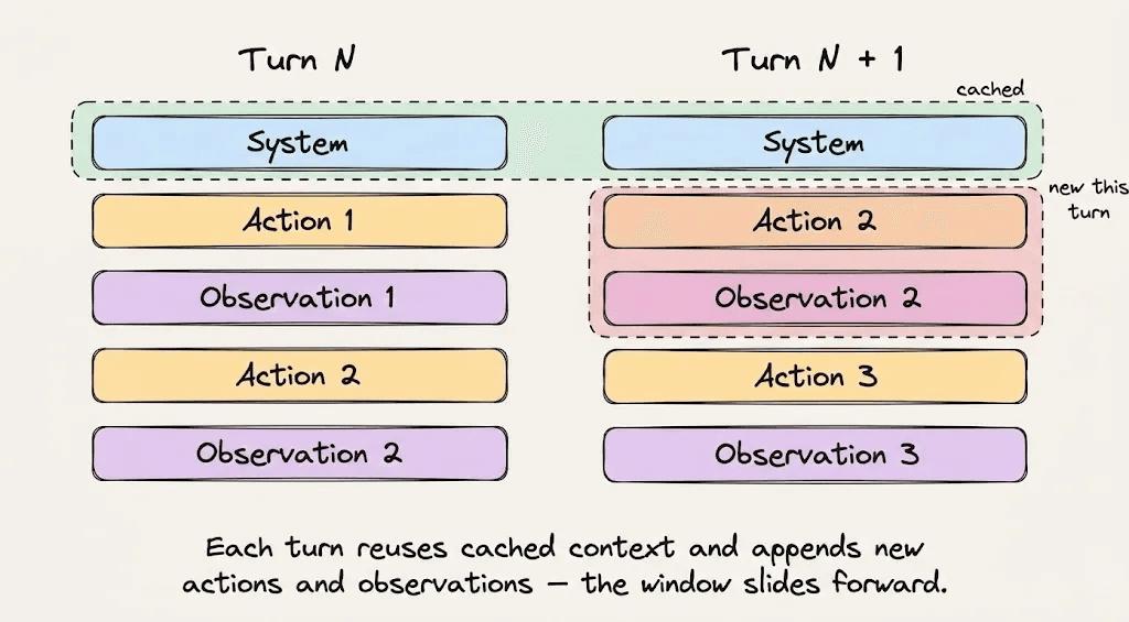 - • 动态后缀:随着每一轮增长的部分:用户消息、助手响应、工具输出和终端观察。